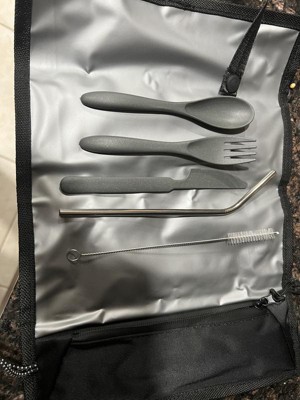 Components: 1 insulated lunch tote, 1 fork, 1 spoon, 1 knife, 1 utensil case, 1 straw cleaner, 1 straw
