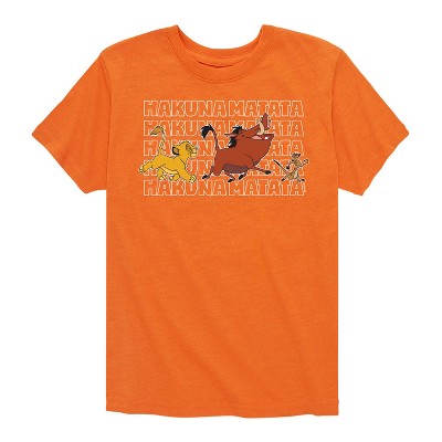 This is a 100% Disney Lion King shirt. Hakuna Matata "ain't no passing craze." Take a page out of Timon and Pumbaa's problem-free philosophy with this fun Lion King tee that features a distressed design of Simba, Timon, and Pumbaa walking in front of a bright orange sunset in the background. The saying Hakuna Matata means no worries! This short sleeve crew neck top is made of a 50% Cotton./ 50% Polyester blend. The tee is a great short sleeve crewneck shirt.