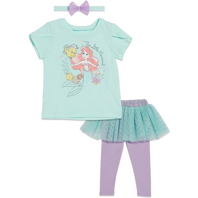 Officially licensed Disney toddler girls 3 piece mix n’ match clothing set: short sleeve graphic tee shirt, leggings, and head band, fashionable tulle skirt, and cute bow headband