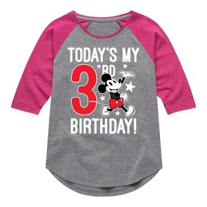 Mickey & Friends - Todays My 3rd Birthday - Toddler And Youth Girls Raglan Graphic T-Shirt - Add a touch of magic to your wardrobe with this graphic apparel featuring iconic Disney designs. Showcasing beloved characters and classic imagery, each piece combines nostalgic charm with modern style—perfect for Disney fans of all ages. Whether you're headed to the parks or just adding whimsy to your everyday look, these graphics bring the magic to life.