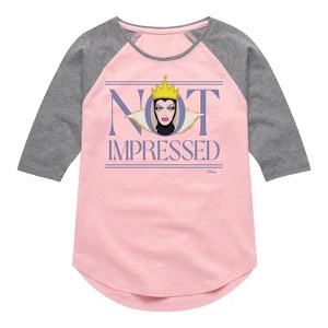 Disney Villains - Not Impressed - Toddler & Youth Girls Raglan Graphic T-Shirt - Unleash your dark side with Disney Villains graphic apparel. Featuring classic baddies like Maleficent, Ursula, and Cruella, these designs let you show off your villainous side.