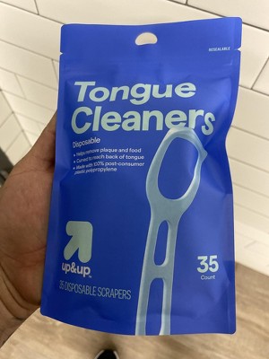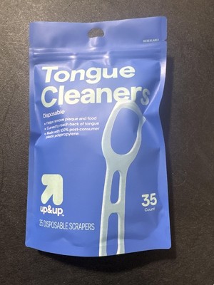 Take care of yourself and your family's oral health with the 35-Count Disposable 2-in-1 Tongue Scrapers from up&up. This pack of tongue scrapers features a curved design that help you remove bad-breath-causing bacteria from the back of your tongue. Made of plastic, these disposable tongue scrapers helps remove plaque and food. Plus, with the pack of 35, you'll have plenty for use at home or during travel.