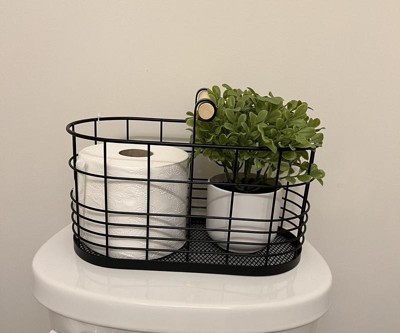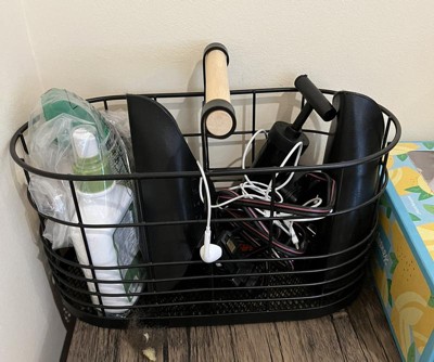 Bring function and decorative style to your space with this Divided Wire Basket with Wood Handle from Brightroom™. This metal storage basket comes in a black powder-coated finish with contrasting wooden top handle to easily carry from one place to another. The open divided storage provides neat organization, and the wire construction lets you see your essentials with ease. Great for holding cosmetics, toiletries and more, it can be spot-cleaned for easy upkeep.
