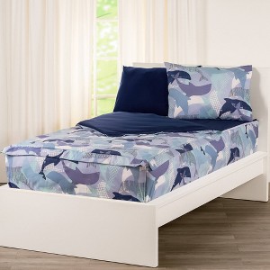 Make bedtime a breeze with Diving Dolphins Bunkie Deluxe from Siscovers! This all-in-one zipper bedding set features a removable and snuggly comforter that's perfect for all seasons. Featuring a zipper that runs along the perimeter of the bed, making the bed has never been easier. The Bunkie Deluxe fits like a fitted sheet over your mattress with a heavy-duty elastic that goes all the way around the bottom. Plus, the detachable comforter and sheet easily zip on and off, making laundry day a breeze. Underneath the comforter and sheet is a built-in mattress protector to keep your mattress safe from spills and accidents. This set also includes matching pillowcases in an envelope style to keep your pillows tucked away safely. Available in Twin and Full sizes and perfect for bunk beds, panel beds, and platform beds.