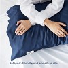 These pillowcases are designed with durability in mind. The blend of rayon derived from bamboo and polyester enhances the fabric's strength, making it more resistant to wear and tear compared to traditional cotton pillowcases. The double-stitched seams add an extra layer of durability, ensuring the pillowcases withstand regular use and washing without losing their integrity. For easy maintenance, the pillowcases are machine washable. It's recommended to wash them in cold water with like colours on a gentle cycle. Use only non-chlorine bleach if necessary, tumble dry on low, and cool iron if needed. To reduce wrinkles, promptly remove the pillowcases from the dryer after the cycle is complete. Please note that rayon derived from bamboo may naturally shrink after washing; however, the manufacturer has accounted for this by slightly increasing the initial size to ensure a proper fit after laundering.