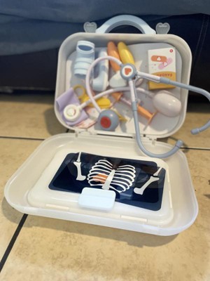 A: The set includes a carrying case, bandages, syringe, scissors, stethoscope, blood pressure cuff, X-ray cards, and more.
