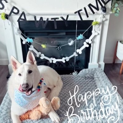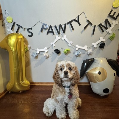 Throw your pet the best birthday party with the Dog Birthday "It's Pawty Time" Banner from Spritz™. This fun and stylish banner is made from durable paper and polyester material, ensuring it lasts through all the festivities. Featuring a cheerful "It's Pawty Time" design, it's sure to add a festive touch to your dog's special day. Easy to hang and reusable, this banner is a must-have for any dog birthday celebration. Make your pup's party unforgettable with Spritz™.