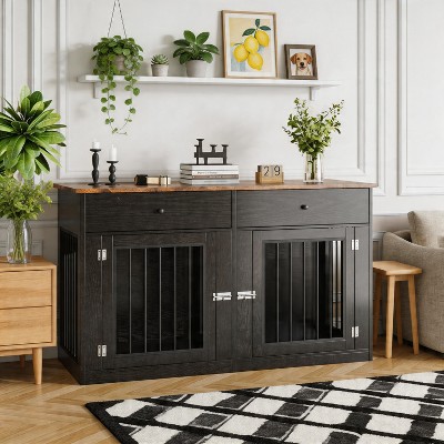 60" Dog Crate Furniture for 2 Dogs, Heavy Duty Dog Kennel Furniture TV Stand with 2 Drawers, Dog Crates for Small Medium Dogs