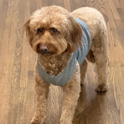 [This review was collected as part of a promotion.] This shirt is hilarious! It’s like a cute little muscle short for you pup. I have a mini Goldendoodle, he’s 2 years old and 25 lbs. I chose the XXL and it fits him perfectly. The shirt is soft and a dark heather gray. It fits well without being too snug in the body and there’s room in the arm holes and the neck. He isn’t usually a dog who wears clothing and isn’t bothered by it.