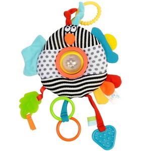 - This crazy character has so much play value! Made from the best quality fabrics in the brightest colours. There are 3 teethers, a spinning bead rattle, a buggy attachment, click clacking rings, ribbon tabs, crinkle and interactive pull through legs.
