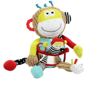 - A mirror on the monkey’s tummy, squeaker, rattle and teethers all add to the fun.