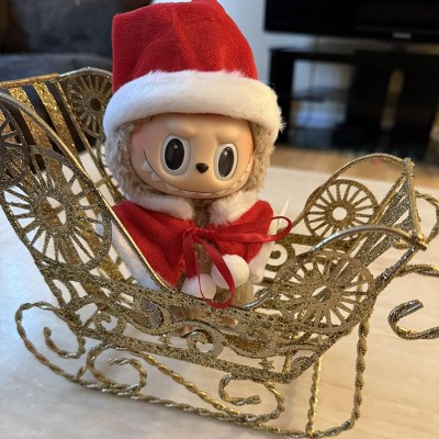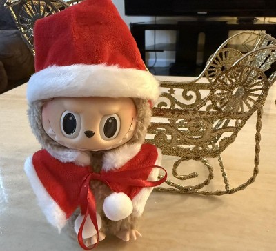 Celebrate the magic of the season with this charming red velveteen cape and hat set designed to fit 17.5cm Labubu dolls. The soft red cape is trimmed with fluffy white faux fur along the bottom edge and ties neatly at the neckline with a satin ribbon. The matching triangle-shaped hat is also trimmed with white faux fur and topped with a playful white pom pom. Perfect for holiday displays, photo shoots, or simply spreading December cheer, this cozy set brings festive spirit and a touch of winter wonder to your Labubu doll's wardrobe. This listing is for one doll outfit, the doll is not included.