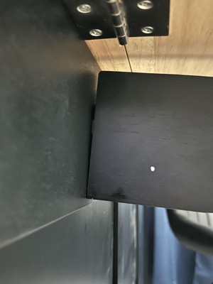 A: It is crafted of solid hardwood and engineered woods in a black satin painted finish, with a natural maple finished solid wood top with a drop leaf