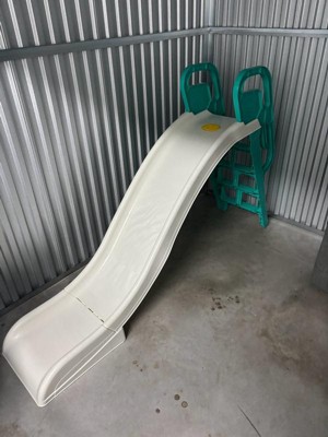 [This review was collected as part of a promotion.] My toddler absolutely loved the slide part of this "indoor or outdoor water slide". Its pretty large, but it is very sturdy. It kept her attention for a good amount of time! Storing this would not be easy at all. It doesnt fold up, but the bolts and such are easy to put together and you could take it apart. The part I had an issue with is that the water hose will not hook up to this at all. In the picture for the instructions they show a fancy white hose perfectly connected to the slide numbered 12. However the fancy white hose is not included. And I cant find a hook up to make our garden hose fit the piece to turn it into a water slide, so that feature is useless without it.
