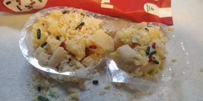 - Contains 2 mini-vanilla cake donuts dipped in vanilla coating with holiday sprinkles