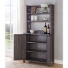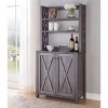 Expand your kitchen storage with this farmhouse inspired Doria Baker Rack from miBasics. Cool tones blend with a faux marble top to present an impressive palette. Sleek dark gray stands out as a trendy finish that accents any entertaining space. Enjoy the linear design of crossed cabinet door fronts in a barn-inspired design. The faux marble top is great for storing small appliances or it can be used as a food prep area.