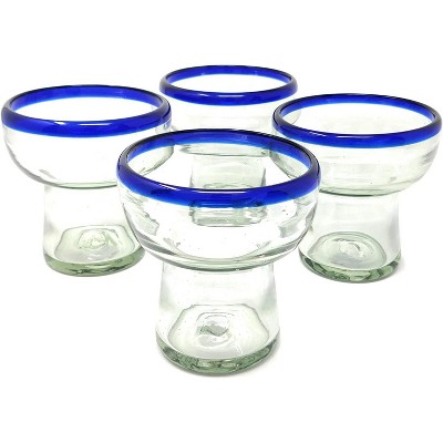 This traditional set of 4 hand blown margarita glasses with blue rims is perfect for your next fiesta! Use them to serve tasty cocktails, lemonade, or your drink of choice. The set adds a great sense of elegance to the dining room that will be enjoyed by everyone. Each blown glass may vary slightly in size and show tiny bubbles within the glass that develop from the blowing process. Lead-free, made from sustainable recycled glass. Hand-washing recommended, but dishwasher safe on the top rack. Exceptional artisan quality, thick and sturdy glass. Proudly hand made in Mexico.