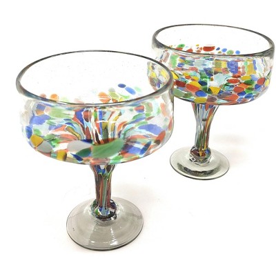 This traditional set of 2 natural hand blown margarita glasses is perfect for your next fiesta! Use them to serve tasty cocktails, lemonade, or your drink of choice. The set adds a great sense of elegance to the dining room that will be enjoyed by everyone. Each blown glass may vary slightly in size and show tiny bubbles within the glass that develop from the blowing process. Lead-free, made from sustainable recycled glass. Hand-washing recommended, but dishwasher safe on the top rack. Exceptional artisan quality, thick and sturdy glass. Proudly hand made in Mexico.