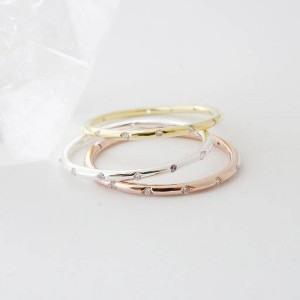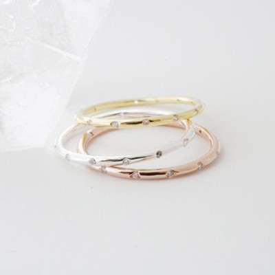Our Dotted Crystal Band brings a charming addition to your jewelry collection, featuring a thin, smooth band lined with a sparkling row of tiny cubic zirconia crystals. Its delicate design makes it perfect for wearing solo when you want a subtle shimmer or stacking with other rings to create a playful, layered look.