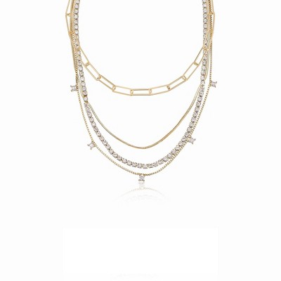 Two layers of delicate, thin chain necklaces featuring horizontal bars. The first layer features a short horizontal bar and the the second layer features a longer horizontal bar. Length: 16" upper chain and 19" lower chain. Top bar is 22 mm, bottom bar is 32 mm.