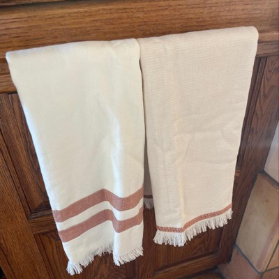 Accent your kitchen with the Double Stripe Cotton Hand Towel from Hearth & Hand™ with Magnolia. This cream hand towel features double stripes in orange hues for a contrasting look that suits your existing decor and it's adorned with fringe to elevate the look. Made with 100% cotton fabric, this lightweight hand towel feels soft and is great for wiping hands or performing cleaning tasks.