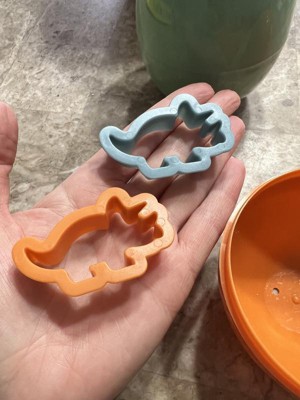 Love this pack of dinosaur eggs with moldable dough! It includes two shape cutters in each egg, with its own pack of super soft dough. Dough is non toxic so not a big hazard to critters on the floor. Love the big egg case that these come in. A very cute design and set out on the table for all the kids to grab their own egg with their own dough and molds without the fights over sharing dough!