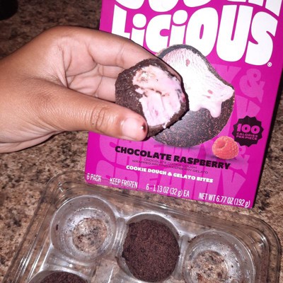 [This review was collected as part of a promotion.] I got the Doughlocious chocolate raspberry cookie dough and gelato bites to try out as a desert. These come in a pack of six and are a good size ball that have a little bit of a hard exterior but easy to bite into. You get a taste of the chocolate on the outer layer then the raspberry gelato in the center that is very sweet. I was not a fan of the flavor of this cookie dough bite and will not be buying it again. I received an incentive to write this review.
