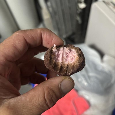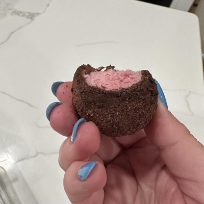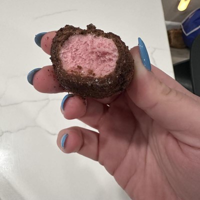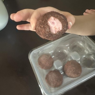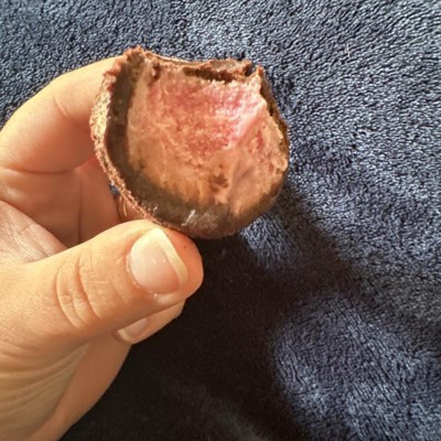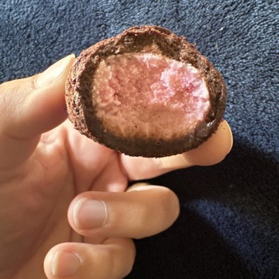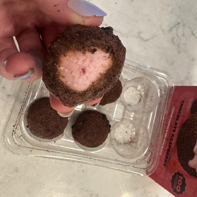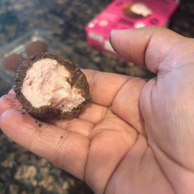[This review was collected as part of a promotion.] These are absolutely DELICIOUS. The inner raspberry part is frozen but the outer chocolate “dough” layer is soft enough to bite in to easily. I appreciate the ratio of chocolate to raspberry, and you’re definitely getting both flavors in each bite! The size is also a PLUS. It takes me about 4 normal size bites to finish so it definitely fulfills the “sweet treat” without leaving you wanting more. I received an incentive to write this review.