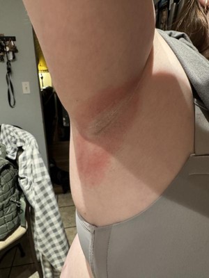 I have been using dive for many years now. The store I went to didn’t have my normal Dove Deodorant. I chose to go with the aluminum free one. I liked the way it glided on and was happy with it. Until after about a week of using it. I have a severe burn/ rash under both my arms. It hurts to touch or put other deodorant on because it now so sensitive. It started with skin peeling and then a rash. Now it’s at the point of raw and very red.
