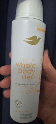 [This review was collected as part of a promotion.] Dove cooling whole body deodorant in the scent peach and white tea gives all day odor control! This deodorant spray has a cooling feel when applied and doesn't leave you sticking while it dries quickly. I love the light scent and that it doesn't irritate my skin. I definitely recommend this product.
