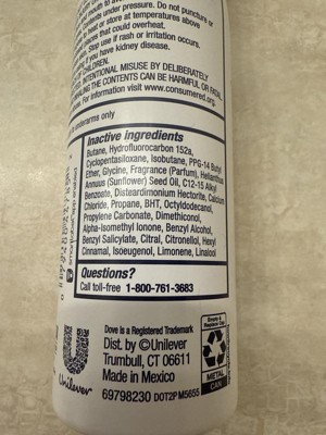 BEWARE!!!! DO NOT USE!!!! I was having chest problems that was never an issue in the past. I am someone who faithfully works out and stay active. I’ve been using this product for a while now and recently stocked up on 3 cans because I saw so many benefits. Until I started out of no where having CHEST PROBLEMS!!!! I’m spiritual and I asked God to show me where it was coming from and one morning God said it’s the Dove Spray. I immediately came to the comments to see if others had the same experience and SURE ENOUGH there was comments regarding this same issue. I’m glad others took time out of their day to WARN others about this harmful chemical that we think is harmless. THROW IT IN THE TRASH NOW!!!!