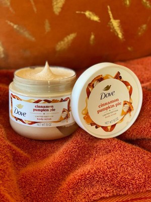 Deck the shower with Dove holiday treats Cinnamon Pumpkin Pie Body Scrub, a Limited-Edition Holiday Treat that promises to indulge your every sense and elevate your shower experience to new heights of delight Imagine falling into the warm embrace of sweet cinnamon spice, mixed with the comforting notes of buttery pumpkin. Savor the delightful scent of sweet creaminess as you lather up exfoliate, while lathering into delicious nourishment to unwrapping the gift of glowing skin you deserve. This slice of home baked goodness is perfect for satisfying your cravings, minus the kitchen mess. Savor the delightful scent of sweet creaminess as you exfoliate into delicious nourishment to provide a luxurious shower experience that restores your skin's natural radiance. Its pH-balanced composition enhances the care it provides, leaving your skin feeling soft and smooth. And to add an extra touch of luxury, this sweet holiday treat for your skin is infused with 1/4 moisturizing cream, gently exfoliating and nourishing your skin with the warm aroma of festive home-baked goodness.