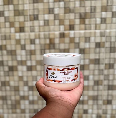 Deck the shower with Dove holiday treats Maple Glaze Donut Body Scrub, a Limited-Edition Holiday Treat that promises to indulge your every sense and elevate your shower experience to new heights of delight. . Imagine falling into the warm embrace of the scent of warm Maple Glaze on a freshly baked donut , mixed with the comforting notes of brown sugar, vanilla, and a hint of cinnamon. Savor the delightful scent of sweet creaminess as you lather up exfoliate, while lathering into delicious nourishment to unwrapping the gift of glowing skin you deserve. This slice of home baked goodness is perfect for satisfying your cravings, minus the kitchen mess. Savor the delightful scent of sweet creaminess as you exfoliate, into delicious nourishment to providing a luxurious shower experience that restores your skin's natural radiance. Its pH-balanced composition enhances the care it provides, leaving your skin feeling soft and smooth. And to add an extra touch of luxury, this sweet holiday treat for your skin is infused with 1/4 moisturizing cream, gently exfoliating and nourishing your skin with the warm aroma of festive home-baked goodness.