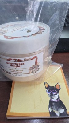 [This review was collected as part of a promotion.] So creamy, and the smell is amazing! The container is very pretty, and you really don't have to apply as much as I did. The Gingerbread scent was still lingering on my skin after washing the scrub off. I like how gently it scrubbed away dead skin, and it left me with a hydrated appearance (even my tattoo looks brighter).