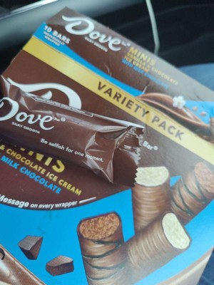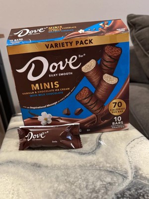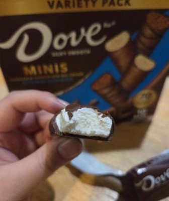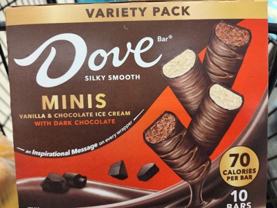 [This review was collected as part of a promotion.] These are delicious! They are packaged individually for freshness and with cute dove-isms on the wrappers. My only issue is...you don't know whether you're taking a chocolate or vanilla ice cream mini because it's not marked on the outside of the package. I love that they are a small size though, the perfect size for a sweet treat!