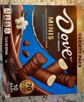 [This review was collected as part of a promotion.] I love these two-bite ice cream bars! The luxurious creamy Dove milk chocolate houses soothingly sweet ice cream, making a refreshing summer treat. Individual wrappers keep each frozen mini bar fresh... and are great to assist with portion control.