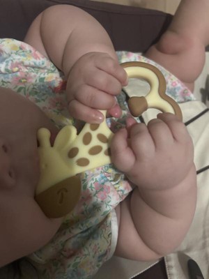 My son was very excited about this teether because he loves giraffes. I have to say he didn’t chew on it much though because the plastic is so hard. There are a couple soft rubber spots that he liked, but I wish there was more soft rubber to chew on. Other babies may not care as much as my son, but he was not a huge fan. He played with it more than using it as a teether. Super cute design though!
