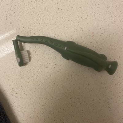 - EASY-GRIP TODDLER TOOTHBRUSH. The shape and material of the dinosaur toothbrush is ideal for helping little fingers maintain a good grip as you help them brush.