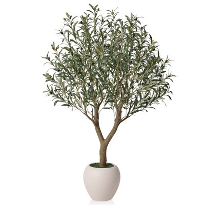 DR.Planzen 5FT Artificial Olive Tree with Real Wood Trunks & Triple-Stem Design in White Planter, Lifelike Faux Tree Plant for Indoor Outdoor Decor