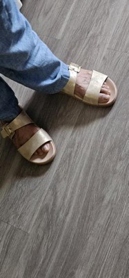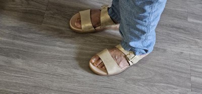 [This review was collected as part of a promotion.] These are extremely comfortable but due to the squishy sole, they do wear in quickly. I don’t gave an issue with that since the worn in bits are hidden when I’m wearing them and they still have great comfort! These are perfect for the warmer months and brushed gold goes really well with any outfit - especially because I’m a gold jewelry gal! Love that the strap is adjustable. I have a very high arch causing me to typically have to buy wide shoes so my arch fits through the strap. The last hole on these straps works perfectly for me without needing a wide. These shoes are true to size but if you’re debating sizing up or down a half shoe size, I’d size down.
