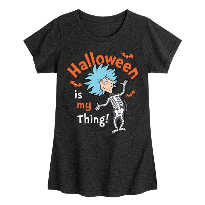 Dr. Seuss - Batty For Halloween Thing 1 and Thing 2 - Toddler And Youth Girls Short Sleeve Graphic T-Shirt - Our collection of graphic apparel featuring officially licensed Dr. Seuss characters brings the whimsy and wonder of Seussville straight into your wardrobe. From the mischievous Cat in the Hat to the stinky Grinch, each design showcases iconic characters and scenes from Dr. Seuss's timeless stories.