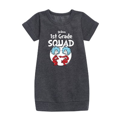 Dr. Seuss - Kindergarten Squad - Youth Girls Fleece Dress - Our collection of graphic apparel featuring officially licensed Dr. Seuss characters brings the whimsy and wonder of Seussville straight into your wardrobe. From the mischievous Cat in the Hat to the stinky Grinch, each design showcases iconic characters and scenes from Dr. Seuss's timeless stories.