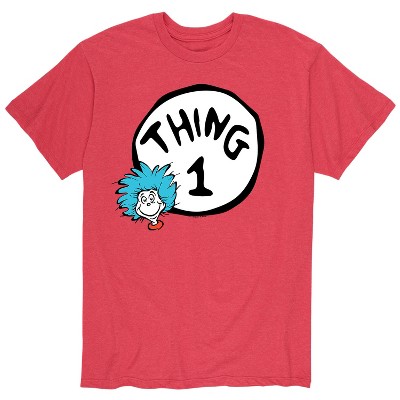 Embrace the fun and whimsy of Dr. Seuss with this adult red crew neck short sleeve t-shirt. Featuring the iconic Thing 1 label, this shirt brings to life the playful spirit of the beloved character. Made from soft cotton, it's ideal for casual wear and easy to care for. Machine wash it on cold with like colors and tumble dry on low heat to keep it looking fresh and ready for everyday adventures.