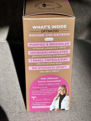 These primal mom colostrum is for beauty and gut health. It has capsules that are very easy to swallow one is only needed daily. It does contain 100 mg of super colostrum. Very easy on the stomach does not upset it at all. These are formulated for women who are lactating and pregnancy.