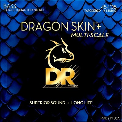 DR Strings Dragon Skin+ coated Accurate Core Technology 4-string stainless steel bass strings are designed for bassists seeking rich, balanced tone and long string life. Dragon Skin+'s patented Accurate Core Technology creates precision grooves in the string core to securely cradle the wrap wire, allowing the strings to ring out with full resonance. A micro-thin coating on the stainless steel wrap wire delivers the feel of an uncoated string with enhanced durability. Whether favor deep rumble or articulated growl, Dragon Skin+ bass strings empower unique tone.