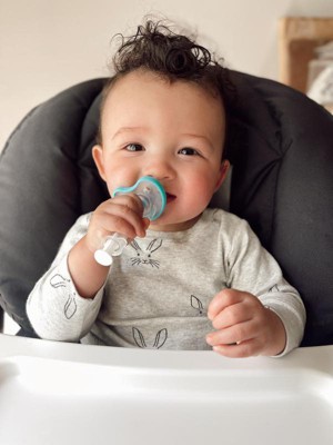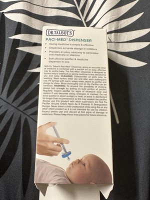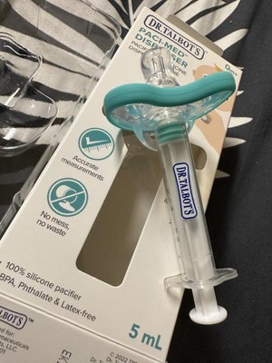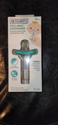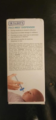 Giving an accurate dose of medicine to your little one has never been easier with Dr. Talbot's Paci-Med Baby Medicine Dispenser. The Paci-Med medicine dispenser combines the ease of a pacifier with the accuracy of a medicine syringe, so every dose is a no-muss, no-fuss experience for little ones. The syringe holds 5 ml of liquid medicine, while the pacifier attachment, shaped like those from the hospital, bypasses baby's taste buds for easy, comfortable relief. The syringe uses standard dosage markings ensure maximum effectiveness and wellness for little ones. This newborn essential is easy to clean and dishwasher and steam sterilizer safe. The Paci-Med Dispenser is made from clear plastic to easily see the medication. Help your little one with congestion, colds, and more, with this easy-to-use baby medicine syringe with pacifier attachment.