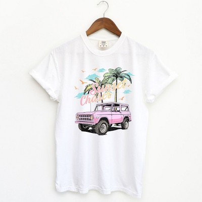 Ride into style with this Dragon Ball Z tee. The shirt features the anime characters driving a blue jeep under red letters that spell out the series title while red kanji letters appear next to the image. The tee comes in a white short sleeve crew neck. Fans of the Dragon Ball Z anime series will love this comfy cotton t-shirt.