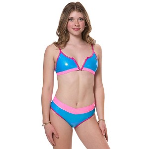 The Santorini Bikini is a modern twist on a timeless silhouette. The triangle-style top features a subtle V-notch detail, adjustable straps, and a secure back clasp. Paired with mid-rise bottoms and a wide waistband, it delivers a flattering fit with full shimmer impact. Designed in our Blue Mirage colorway—bright aqua with bubblegum pink accents—this set brings the heat without breaking a sweat. Features: Triangle-style bikini top with V-notch detail and adjustable straps Mid-rise bottoms with wide contrast waistband Shimmer-finish fabric in Blue Mirage colorway Fully lined for comfort and coverage Quick-dry, stretch-infused material Available in youth and adult sizes