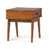 Handcrafted using the finest quality solid rubberwoodHand-finished with a Rich Teak Brown stain and a protective NC lacquer to accentuate and highlight the grain and the uniqueness of each piece of furnitureMultipurpose table can be used as an end table or side table. Looks great in your living room, great room, condo or bedroomFeatures a spacious drawer with metal drawer glides and recessed drawer pull in an Antique Brass hardware finishMid Century Modern design with tapered legsAssembly Required