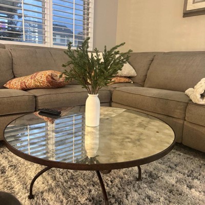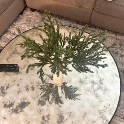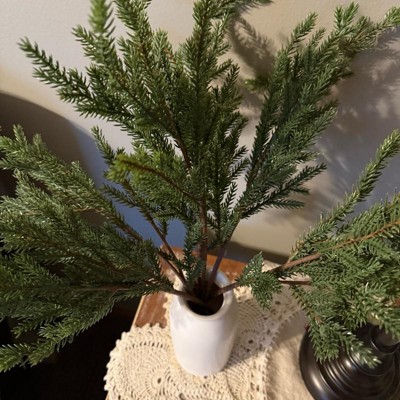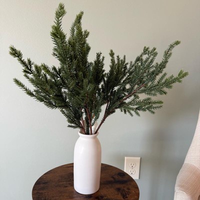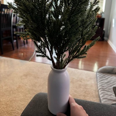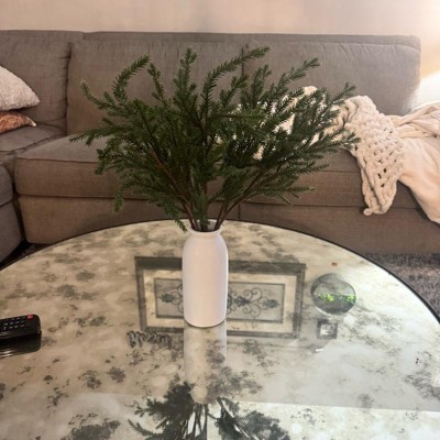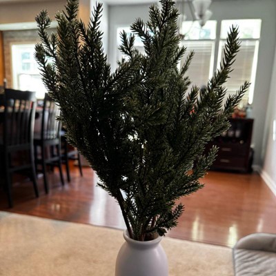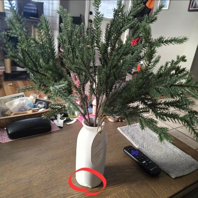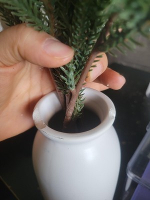 [This review was collected as part of a promotion.] This is such a pretty pine arrangement in a wonderful and sturdy vase! I love that the pine stems do not come out. There is plenty of room to add additional stems to add color or adjust for Christmas or winter. I wish there was just maybe two more stems added to the vase however, it’s not quite as thick as I would like it to be. Overall, the face is great quality, and the pine is very realistic looking. I received an incentive to write this review.